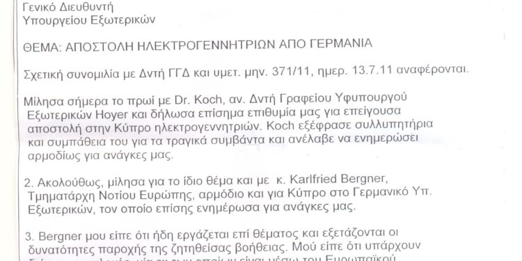 Και ενώ ο Μάρκος Κυπριανού υπέβαλε την παραίτηση του αποκαλυπτική αλληλογραφία μεταξύ του Υπουργείου Εξωτερικών και του αντίστοιχου υπουργείου της Γερμανίας, όπου φαίνεται πως η χώρα, δύο ημέρες μετά την τραγωδία, εκδήλωσε ετοιμότητα να παράσχει στην Κύπρο μία μονάδα με πέντε γεννήτριες, για να συμβάλει στην αντιμετώπιση της ενεργειακής κρίσης, έφερνε στο φως της δημοσιότητα το κυπριακό site Sigmalive.