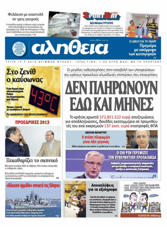 Η «Αλήθεια» υπό τον τίτλο «Δεν πληρώνουν εδώ και μήνες» γράφει ότι σύμφωνα με τον Αναπληρωτή Πρόεδρο του ΔΗΣΥ Αβέρωφ Νεοφύτου η στάση πληρωμών είναι γεγονός, με το κράτος να χρωστά 572.851.522 ευρώ αποζημιώσεις για απαλλοτριώσεις, δεκάδες εκατομμύρια σε προμηθευτές, ενώ εκκρεμούν 137 εκ. ευρώ επιστροφές ΦΠΑ και να πληρώνει μόνο μισθούς. Αναφέρει επίσης ότι ο κοινοτικός Επίτροπος Ολι Ρεν δηλώνει ότι η κυπριακή οικονομία αντιμετωπίζει σοβαρές μακροοικονομικές ισορροπίες. Αλλού γράφει ότι το λιμάνι της Λεμεσού ανεφοδιάζει τα ρωσικά πολεμικά πλοία που πραγματοποιούν ασκήσεις στην ανατολική Μεσόγειο.
