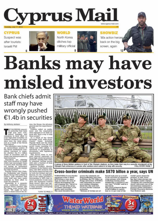 Η αγγλόγλωσση “Cyprus Mail” υπό τον τίτλο «Οι τράπεζες μπορεί να παραπλάνησαν τους επενδυτές» γράφει ότι οι Διευθυντές των τραπεζών παραδέχονται ότι εσφαλμένα ώθησαν ποσό 1,4 δις σε επενδύσεις αξιογράφων. Σε άλλο θέμα γράφει ότι τα Ηνωμένα Εθνη αναφέρουν ότι ο ετήσιος τζίρος του διασυνοριακού εγκλήματος ανέρχεται στα 870 δισεκατομμύρια δολάρια. Σε άλλο θέμα γράφει ότι σύμφωνα με πληροφορίες της εφημερίδας ο συλληφθείς για ενδεχόμενες τρομοκρατικές ενέργειες σε βάρος του Ισραήλ έφθασε στην Κύπρο από τη Βρετανία.