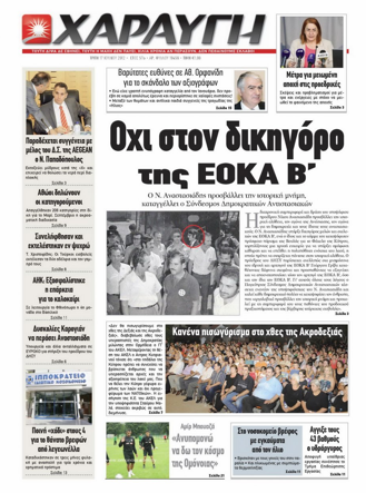 Η «Χαραυγή» υπό τον τίτλο «Όχι στον δικηγόρο της ΕΟΚΑ Β΄» γράφει ότι ο Παγκύπριος Σύνδεσμος Δημοκρατικών Αντιστασιακών τάσσεται κατά της υποψηφιότητας Αναστασιάδη για τις προεδρικές καθώς κρίνει ότι η διαχρονική συμπεριφορά του υποψηφίου Προέδρου προσβάλλει την ιστορική αλήθεια και τους ίδιους τους αντιστασιακούς. Σε άλλο θέμα γράφει ότι ο τέως Διοικητής της Κεντρικής Τράπεζας Αθανάσιος Ορφανίδης ενώ είναι ενυπόγραφη γραπτή καταγγελία από τον Ιανουάριο για τα αξιόγραφα περιορίστηκε σε χαλαρές συστάσεις. Γράφει ακόμα ότι Υπουργός Εσωτερικών και Κόμματα εξετάζουν αντιμετώπιση της αποχής στις προεδρικές.