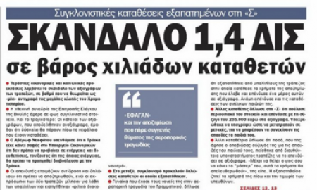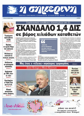 «Η Σημερινή» αναφέρεται στις τεράστιες οικονομικές και κοινωνικές προεκτάσεις που λαμβάνει το σκάνδαλο των αξιογράφων των τραπεζών και στεγάζει το θέμα υπό τον τίτλο «Σκάνδαλο 1,4 δις σε βάρος χιλιάδων καταθετών». Σε άλλα θέματα γράφει ότι το Ευρωπαϊκό Πανεπιστήμιο ανακοίνωσε την επίσκεψη του πρώην Προέδρου των ΗΠΑ στην Κύπρο Μπιλ Κλίντον το Σάββατο. Γράφει ακόμα ότι η Triple Five είναι ενοχλημένη με τις Κυπριακές Αερογραμμές.