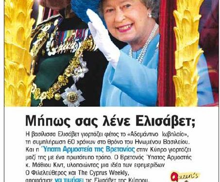 Δεν είναι προς τιμήν σας, του Φιλελεύθερου και της CYPRUS WEEKLY , που ο Ύπατος Αρμοστής των Άγγλων, κύριος Κιντ, υιοθέτησε την παρότρυνση των εφημερίδων σας να γιορτάσει και η Κύπρος, μάλιστα με τον τρόπο που μας προσβάλει διπλά, το Ιωβηλαίο της Βασίλισσας. Με το τέχνασμά του αυτό, ο κύριος Κιντ θέλει αφενός να μας υπενθυμίσει ότι ακόμα είμεθα υπό την κατοχή τους και αφετέρου πως η αποικιοκρατία δεν έκανε κανένα κακό στην Κύπρο, αλλά αντιθέτως τόσο καλοί ήσαν οι Άγγλοι, που εκατοντάδες Κύπριοι ονόμασαν τα παιδιά τους Ελισάβετ προς τιμήν της Βασίλισσάς τους. Φυσικά μ’ αυτά θέλουν να αποκρύψουν κάτι άλλο, πως η κυρία αυτή δεν είναι αναμεμειγμένη στη δολοφονία των εννέα απαγχονισθέντων αγωνιστών μας.