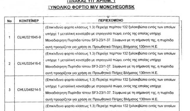 Τα 51 από τα 98 εμπορευματοκιβώτια χαρακτηριζόταν ως «Επικίνδυνο φορτίο κλάσεως 1.3 και 1.3C1 αφού περιείχαν «μεταλλικές κονσέρβες με κόκκους μαύρης πυρίτιδας» και  «μονοδιάτρητη πυρίτιδα τύπου SF3-23/1-37».  Επίσης καταγράφονται 33 κιβώτια που χαρακτηρίζονται ως «επικίνδυνο φορτίο κλάσης 1» αφού περιείχαν 132 ξυλοκιβώτια βάρους 45 κιλών έκαστο, εντός των οποίων υπήρχε 1 μεταλλική κονσέρβα με στρογγυλό πώμα εντός της οποίας υπήρχε Μονοδιάτρητη πυρίτιδα που προορίζεται για χρήση σε προωθητικό βλήματος 125mm.