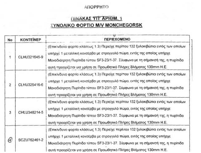 Το Sigmalive εξασφάλισε απόρρητο έγγραφο με την αναλυτική καταγραφή του περιεχομένου των εμπορευματοκιβωτίων όπως ετοιμάστηκε από τον Συνταγματάρχη Γεωργιάδη Γεώργιο για λογαριασμό του Συμβουλίου Ασφαλείας.