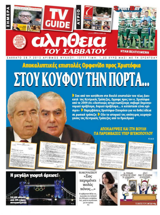 Η «Αλήθεια», με τίτλο «Στου κουφού την πόρτα…», αναφέρεται στις επιστολές του τέως Διοικητή της ΚΤ προς τον Πρόεδρο Χριστόφια για την κατάσταση της οικονομίας και παρεμβάσεις των Χριστόφια και Σταυράκη υπέρ ρωσικής τράπεζας, αλλά και για παρεμβάσεις υπέρ Βγενόπουλου. Αλλού γράφει ότι η μεγάλη γιορτή άρχισε και πως 10.500 αθλητές από 204 χώρες συναγωνίζονται στους Ολυμπιακούς αγώνες του Λονδίνου. Σε άλλο θέμα προβάλλει τοποθετήσεις της Τρόικας ότι αν δεν υπογραφεί μνημόνιο η κυπριακή οικονομία οδεύει προς την καταστροφή.
