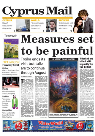 Η αγγλόγλωσση εφημερίδα «Cyprus Mail», υπό τον τίτλο «Τα μέτρα θα είναι επώδυνα», γράφει στο κύριό της θέμα για τις επαφές της Τρόικας που ολοκλήρωσε την επίσκεψή της, αλλά οι συνομιλίες θα συνεχιστούν κατά τον Αύγουστο. Σε άλλο θέμα αναφέρεται στα έγγραφα του Φόρειν Οφις κατά τον αγώνα της ΕΟΚΑ και το ρόλο των βρετανικών αποικιακών δυνάμεων. Αλλού γράφει ότι οι Κυπριακές Αερογραμμές δεν θα έβγαζαν το καλοκαίρι χωρίς «οικονομική ένεση», προσθέτοντας ότι οι Βουλευτές ήραν χθες κάποιους από τους αυστηρούς όρους για τη χρηματοδότηση της εταιρείας.