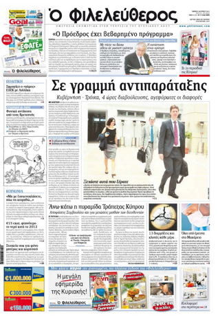 «Ο Φιλελεύθερος», υπό τον τίτλο «Σε γραμμή αντιπαράταξης», γράφει για 4 ώρες διαβούλευσης κυβέρνησης – Τρόικας και κάνει λόγο για μάξιμουμ θέσεις της Τρόικας και αγεφύρωτες διαφορές. Σε άλλο θέμα γράφει ότι σφραγίζει σήμερα ο «γάμος» της ΕΔΕΚ με τον Λιλλήκα. Αλλού γράφει ότι η πυραμίδα της Τράπεζας Κύπρου έγινε άνω – κάτω και το ΔΣ αποφάσισε μειώσεις μισθών των Διευθυντών.