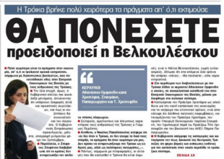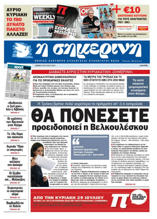 «Θα πονέσετε, προειδοποιεί η Βελκουλέσκου», γράφει «Η Σημερινή» στο κύριο της θέμα, προσθέτοντας ότι η Τρόικα βρήκε πολύ χειρότερα τα πράγματα απ’ ότι εκτιμούσε. Αλλού αναφέρεται στα θύματα του καύσωνα που έχουν φτάσει τα 18, ενώ σε άλλο θέμα γράφει ότι οι υπερωρίες στα νοσοκομεία έχουν καταντήσει Λερναία Ύδρα και ο Υπουργός Υγείας αναμένει τα αποτελέσματα της έρευνας για τις καταγγελίες εναντίον γυναικολόγου στο Μακάρειο Νοσοκομείο.