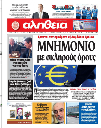 «Μνημόνιο με σκληρούς όρους» είναι ο πρωτοσέλιδος τίτλος της «Αλήθειας», η οποία γράφει ότι την ερχόμενη εβδομάδα έρχεται στην Κύπρο η Τρόικα, καθώς και ότι επιταχύνεται η απόφαση για την ένταξη της Κύπρου στο Μηχανισμό από τις Βρυξέλλες, προσθέτοντας ότι μπορεί να παρθεί και σήμερα.