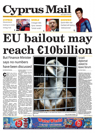Η αγγλόγλωσση «Cyprus Mail», με πρωτοσέλιδο τίτλο «Το πακέτο διάσωσης της ΕΕ μπορεί να φτάσει τα 10 εκ. ευρώ», επικαλείται δηλώσεις δύο αξιωματούχων της ευρωζώνης επί του θέματος, προσθέτοντας όμως ότι ο Υπουργός Οικονομικών δήλωσε ότι το ύψος του ποσού δεν έχει καθοριστεί, καθώς και ότι η εμπλοκή του ΔΝΤ είναι ακόμη υπό συζήτηση. Η εφημερίδα προβάλλει επίσης την ομιλία του Προέδρου Χριστόφια χθες σε συνέδριο για την ενέργεια για την επιθυμία της Κυβέρνησης να μετατρέψει το νησί σε ενεργειακό κόμβο. Αλλού, αναφέρεται σε επεισόδιο που δημιουργήθηκε χθες κατά τη διάρκεια του συνεδρίου όταν ζητήθηκε από τους οργανωτές του συνεδρίου να αναχωρήσει ο Πρέσβης του Ισραήλ λόγω παραπόνου που υπέβαλε ο Υπουργός Ενέργειας του Λιβάνου.