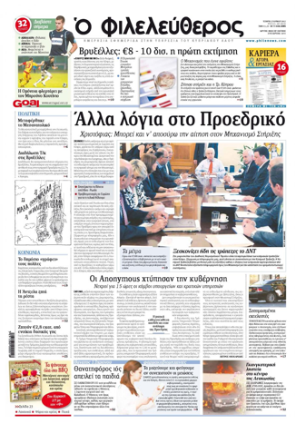 Ο «Φιλελεύθερος» έχει πρωτοσέλιδο τίτλο «Αλλα λόγια στο Προεδρικό» προβάλλει τη χθεσινή συνάντηση Προέδρου – κομμάτων στο Προεδρικό για την οικονομία και γράφει ότι ο Πρόεδρος Χριστόφιας άφησε ανοικτό το ενδεχόμενο απόσυρσης του κυπριακού αιτήματος για το Μηχανισμό σε περίπτωση θετικής εξέλιξης στο θέμα διακρατικών δανείων από Ρωσία και Κίνα.