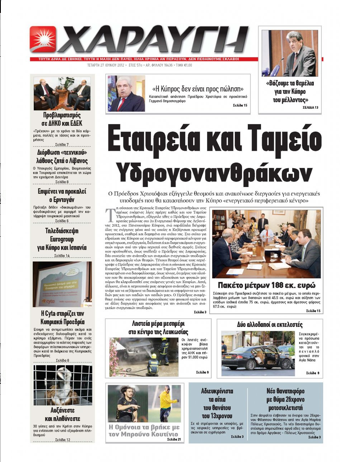 «Εταιρεία και Ταμείο Υδρογονανθράκων» είναι ο πρωτοσέλιδος τίτλος της «Χαραυγής» που αναφέρεται στην εξαγγελία το Προέδρου Χριστόφια δημιουργίας θεσμών και στις διεργασίες για ενεργειακές υποδομές που θα καταστήσουν την Κύπρο «ενεργειακό περιφερειακό κέντρο».