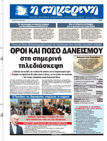 Η «Σημερινή» στεγάζει το πρωτοσέλιδό της υπό τον τίτλο «Οροι και ποσό δανεισμού στη σημερινή τηλεδιάσκεψη», αναφέρεται επίσης στο θέμα της διάσωσης της κυπριακής οικονομίας, γράφοντας ότι θα γίνει σήμερα τηλεδιάσκεψη των Υπουργών Οικονομικών της ευρωζώνης και φιλοξενεί δήλωση εκπροσώπου του Ολι Ρεν ότι οι όροι του δανείου που θα δοθεί θα είναι αναλόγως του σκοπού και του ποσού.