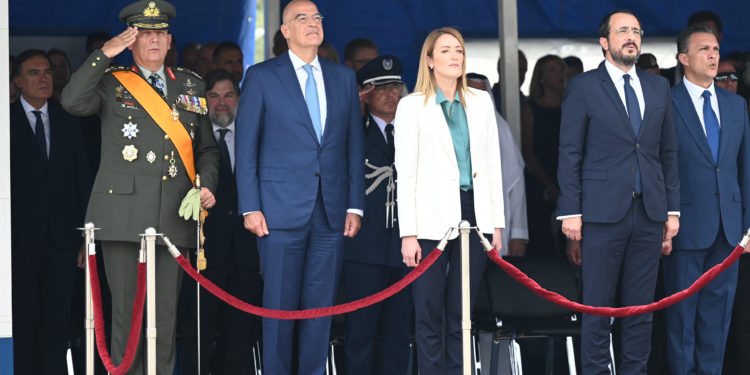 Ο ΥΕΘΑ Νίκος Δένδιας παρακολούθησε την στρατιωτική παρέλαση στη Λευκωσία, μαζί με τον Πρόεδρο της Κυπριακής Δημοκρατίας Νίκο Χριστοδουλίδη, την Πρόεδρο του Ευρωπαϊκού Κοινοβουλίου Roberta Metsola, τον Κύπριο ομόλογό του Μιχάλη Γιωργάλλα, τον Αρχηγό ΓΕΕΘΑ Στρατηγό Κωνσταντίνο Φλώρο και τον Αρχηγό ΓΕΕΦ Αντιστράτηγο Γεώργιο Τσιτσικώστα.