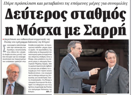 Σύμφωνα με πληροφορίες της εφημερίδας, εντός των ημερών αναμένεται να μεταβεί στη Μόσχα ο Κύπριος υπουργός Οικονομικών Μιχάλης Σαρρής, ο οποίος πρόκειται να συζητήσει με τη ρωσική κυβέρνηση τόσο το αίτημα της Κύπρου για επιμήκυνση της αποπληρωμής του δανείου των 2,5 δισ. ευρώ όσο και την ουσιαστική συμμετοχή της Ρωσίας στο νέο πακέτο διάσωσης της κυπριακής οικονομίας, ενδεχομένως και μέσω του τραπεζικού τομέα.