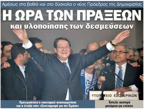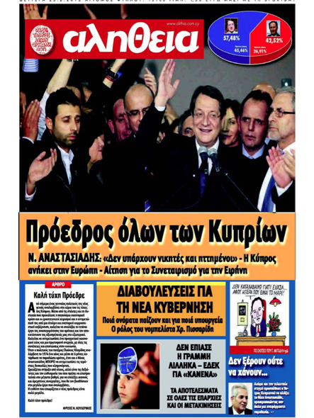 Η «Αλήθεια», υπό τον τίτλο «Πρόεδρος όλων των Κυπρίων», αναφέρεται στις πρώτες δεσμεύσεις του Νίκου Αναστασιάδη για αποκατάσταση της αξιοπιστίας της Κύπρου στην Ευρώπη και για αίτηση για ένταξη στον Συνεταιρισμό για την Ειρήνη. Σε άλλο θέμα αναφέρεται στις διαβουλεύσεις για την νέα Κυβέρνηση, ποια ονόματα παίζουν και για ποια Υπουργεία. Αλλού γράφει ότι δεν έπιασε η γραμμή Λιλλήκα-ΕΔΕΚ για «κανένα».