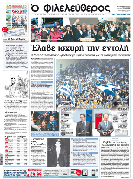 «Ο Φιλελεύθερος», υπό τον τίτλο «Έλαβε ισχυρή την εντολή», γράφει ότι με το υψηλότερο ποσοστό που εξασφάλισε ο όποιος προηγούμενος Πρόεδρος της Δημοκρατίας, 57,48%, ο Νίκος Αναστασιάδης είναι ο νέος εκλελεγμένος ηγέτης της χώρας. Σε άλλο θέμα αναφέρεται στις δηλώσεις του Σταύρου Μαλά, ο οποίος είπε ότι «θα είμαστε αυστηροί κριτές για όσες ενέργειες ή χειρισμούς κρίνουμε ότι εκφεύγουν από την εξυπηρέτηση του καλώς νοούμενου συμφέροντος της πατρίδας και του λαού μας». Αλλού αναφέρεται στις δηλώσεις του Γενικού Γραμματέα του ΑΚΕΛ Άντρου Κυπριανού ότι το αποτέλεσμα των εκλογών καθιστά το κόμμα του ισχυρή αντιπολίτευση.