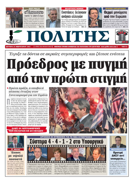 Ο «Πολίτης», υπό τον τίτλο «Πρόεδρος με πυγμή από την πρώτη στιγμή», γράφει ότι με αφορμή κάποια γιουχαΐσματα στο στάδιο «Ελευθερία» κατά την αναφορά Αναστασιάδη στους ανθυποψηφίους του, Σταύρο Μαλά και Γιώργο Λιλλήκα, ο νέος Πρόεδρος σε έντονο ύφος υπέδειξε ότι ο ίδιος απαιτεί σεβασμό στη διαφορετική άποψη. Σε άλλο θέμα αναφέρεται ότι ο Σταύρος Μαλάς έχασε με υψηλό ποσοστό. Αλλού γράφει ότι τέσσερα Υπουργεία πάνε στον ΔΗΣΥ, τέσσερα στο ΔΗΚΟ, ένα στο ΕΥΡΩΚΟ και άλλα δύο που θα προταθούν στην ΕΔΕΚ ή σε πρόσωπα κοινής αποδοχής.