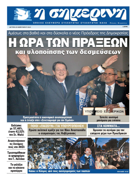 «Η Σημερινή», υπό τον τίτλο «Η ώρα των πράξεων και υλοποίησης δεσμεύσεων», γράφει ότι προτεραιότητα του νέου Προέδρου της Δημοκρατίας Νίκου Αναστασιάδη είναι η οικονομική ανασυγκρότηση και η ένταξη στον Συνεταιρισμό για την Ειρήνη, ενώ έστειλε μηνύματα για ενότητα. Αλλού γράφει ότι «κάηκε η Κύπρος από τους πανηγυρισμούς των νικητών». Σε άλλο θέμα γράφει ότι στα κόμματα άρχισαν τα σενάρια για την επόμενη ημέρα των εκλογών.