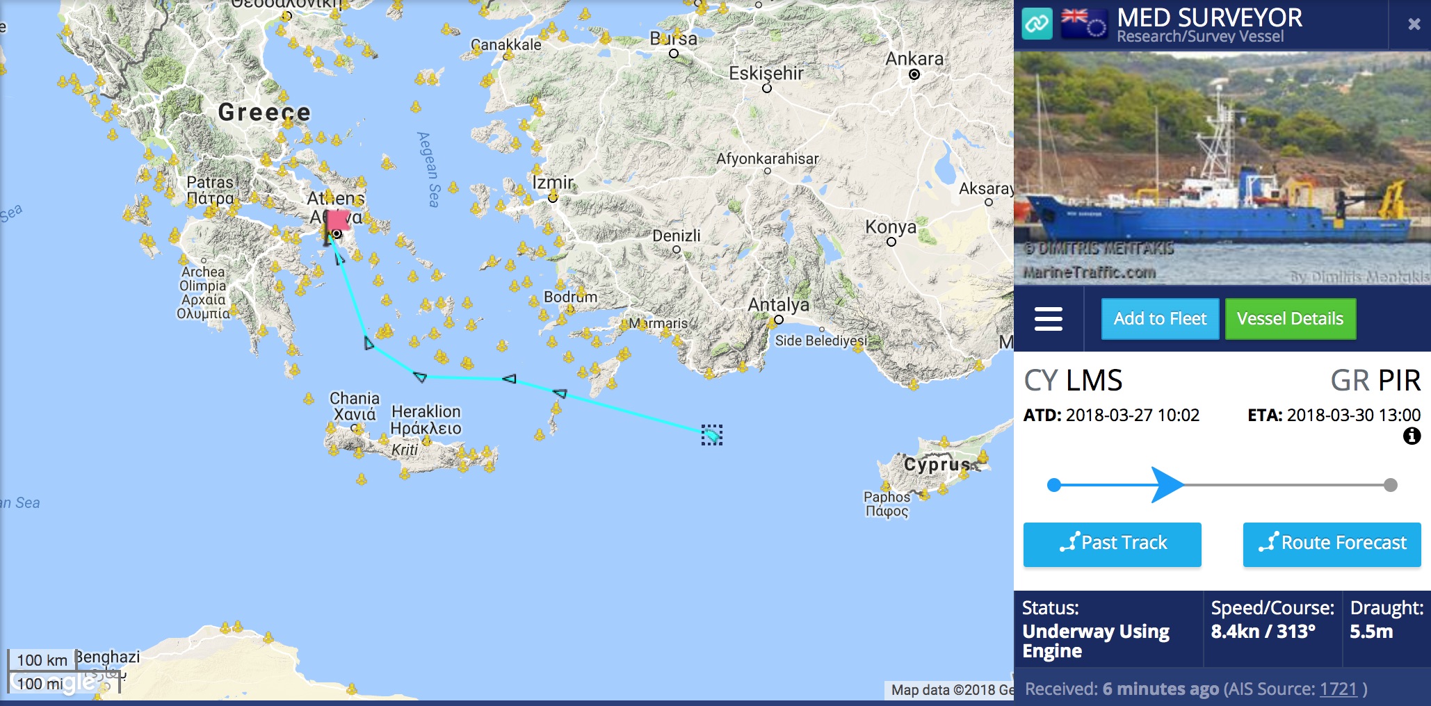 Το δεύτερο ερευνητικό σκάφος Med Surveyor, το οποίο διεξήγαγε τις περιβαλλοντικές έρευνες, απέπλευσε από το λιμάνι Λεμεσού με προορισμό τον Πειραιά.