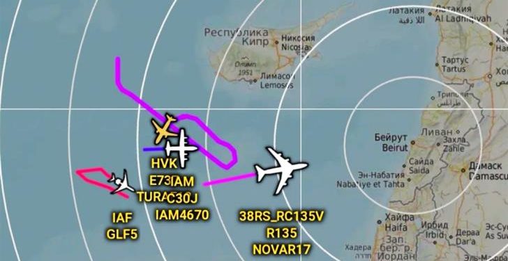Κατασκοπευτικά αεροπλάνα της Τουρκίας, των ΗΠΑ και του Ισραήλ συσσωρεύτηκαν το μεσημέρι και το απόγευμα της Κυριακής δυτικά και νοτιοδυτικά της Κύπρου και εντός του Fir Λευκωσίας. Το γεγονός δείχνει ότι υπάρχει ιδιαίτερη θαλάσσια δραστηριότητα στην περιοχή, την ίδια ώρα που το γαλλικό αεροπλανοφόρο Σαρλ Ντε Γκολ είχε ήδη δέσει στο λιμάνι Λεμεσού και άλλα πολεμικά πλοία στο λιμάνι Λάρνακας.