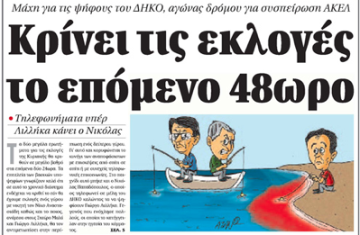Ο «Πολίτης» στο κύριο του θέμα με τίτλο «Κρίνει τις εκλογές το επόμενο 48ωρο» αναφέρει πως γίνεται μάχη για τις ψήφους του ΔΗΚΟ και αγώνας δρόμου για συσπείρωση του ΑΚΕΛ και πως ο Νικόλας Παπαδόπουλος τηλεφωνεί σε μέλη του ΔΗΚΟ καλώντας τα να ψηφίσουν Γιώργο Λιλλήκα. Σε άλλο θέμα σημειώνει η ιταλική ENI έχει ενημερώσει την κυπριακή πλευρά ότι σήμερα θα γίνει έμβασμα περίπου 150 εκατομμυρίων ευρώ στο κρατικό ταμείο, ποσό που αντιστοιχεί στο «μπόνους υπογραφής» για τα τεμάχια 2,3 και 9 της ΑΟΖ. Αλλού σημειώνει πως ούτε μπορούμε, ούτε μας συμφέρει να προπωλήσουμε το φυσικό αέριο της «Αφροδίτης» αφού στην καλύτερη περίπτωση θα παίρναμε κοντά στα δυο δισεκατομμύρια, ποσό που αντιστοιχεί περίπου στο 2% της πραγματικής αξίας του θησαυρού που κρύβει η γεώτρηση.