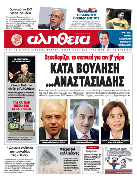 Η «Αλήθεια» στο κύριο της θέμα με τίτλο «Κατά βούληση … Αναστασιάδης» αναφέρει πως απομονωμένη φαίνεται να είναι η υποψηφιότητα του ΑΚΕΛ στο δεύτερο γύρο των προεδρικών εκλογών, αφού τόσο η ΕΔΕΚ όσο και το ΕΥΡΩΚΟ και οι Οικολόγοι άσκησαν και ασκούν έντονη κριτική στη διακυβέρνηση Χριστόφια, κόβοντας τις γέφυρες συνεννόησης με το κυβερνών κόμμα. Αλλού αναφέρει πως εκτεταμένες ιδιωτικοποιήσεις, συρρίκνωση του τραπεζικού τομέα και έλεγχοι για ξέπλυμα από ιδιωτικό οίκο θέτει ως προϋποθέσεις για τη δανειακή σύμβαση της Κύπρου ο Γιοργκ Ασμουσεν. Αλλού σημειώνει πως το Κακουργιοδικείο μετά από αίτημα του Γεν. Εισαγγελέα ανέστειλε την ποινική δίωξη των τεσσάρων κατηγορουμένων για την αεροπορική τραγωδία αλλά και της εταιρείας “Helios Airways” μετά την καταδίκη από ελληνικό δικαστήριο.