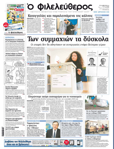 «Ο Φιλελεύθερος» με κύριο τίτλο «Των συμμαχιών τα δύσκολα» αναφέρει πως πυρετός διεργασιών και επαφών ενόψει του δεύτερου γύρου των προεδρικών εκλογών έχει ξεκινήσει από το βράδυ της περασμένης Κυριακής, ωστόσο οι δυνατότητες συνεργασιών είναι απομακρυσμένες. Αλλού σημειώνει πως δεν έλειψαν από την εκλογική διαδικασία της Κυριακής οι καταγγελίες και τα παρατράγουδα Σε κάποιες περιπτώσεις ψηφοφόροι φωτογράφισαν το ψηφοδέλτιο με το κινητό τους τηλέφωνο και η υπόθεση πήρε το δρόμο της νομικής διερεύνησης. Σε άλλο θέμα γράφει πως πληρώνουμε ακόμη εκατομμύρια για το νέο νοσοκομείο Λευκωσίας με τον αρχιτέκτονα να διεκδικεί αποζημιώσεις 10 εκατομμύρια ευρώ και τα ον εργολάβο 100 εκατομμύρια ευρώ.