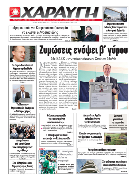 Η «Χαραυγή» αναφέρει στο κύριο της θέμα με τίτλο «Ζυμώσεις ενόψει β’ γύρου» πως με κύριο ζητούμενο την ανατροπή των όποιων προγνωστικών και προβλέψεων το επιτελείο Σταύρου Μαλά και ο ίδιος άρχισαν και συνεχίζουν την επαφή τους με τους πολίτες ή και οργανωμένα σύνολα, όσους ιδιαίτερα δεν επιλέγουν Νίκο Αναστασιάδη. Αλλού σημειώνει πως ο Πρόεδρος του Ευρωπαϊκού Σοσιαλιστικού Κόμματος Σεργκέι Στανίσεφ κάλεσε τους Κύπριους ψηφοφόρους να συσπειρωθούν γύρω από τον Σταύρο Μαλά. Γράφει επίσης πως ο ΓΓ του ΑΚΕΛ κάλεσε τον κόσμο να φράξει το δρόμο στις συντηρητικές πολιτικές Αναστασιάδη, εκλέγοντας το Στ. Μαλά.