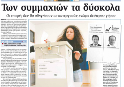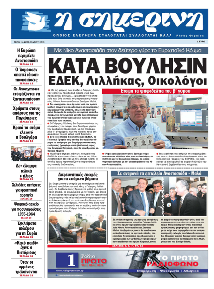 «Η Σημερινή» με κύριο τίτλο «Κατά βούλησιν ΕΔΕΚ, Λιλλήκας, Οικολόγοι» αναφέρει πως με τις ψήφους που έλαβε ο Γιώργος Λιλλήκας κατά το προχθεσινό πρώτο γύρο των προεδρικών εκλογών … φλερτάρουν τα επιτελεία των δυο νικητών της περασμένης Κυριακής Νίκου Αναστασιάδη και Σταύρου Μαλά. Αλλού σημειώνει πως σε διερευνητικές επαφές για τα επόμενα πολιτικά του βήματα βρίσκεται από χθες ο Γιώργος Λιλλήκας. Σε άλλο θέμα σημειώνει πως σε στάση αναμονής ως προς τις αποφάσεις των δυνάμεων που στήριξαν Γιώργο Λιλλήκα βρίσκονται τα επιτελεία Νίκου Αναστασιάδη και Σταύρου Μαλά.