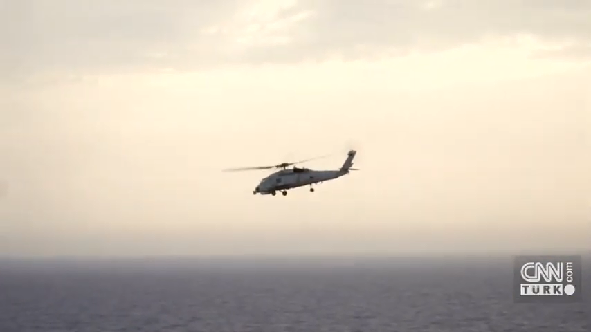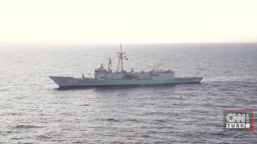 Η κάμερα του τουρκικού καναλιού στρέφεται προς την φρεγάτα Γκαζιάντεπ, η οποία μαζί με άλλες φρεγάτες εναλλάξ προστατεύουν, όπως αναφέρει, το γεωτρύπανο 24 ώρες το 24ωρο. Η κάμερα στρέφεται και σε ένα στρατιωτικό ελικόπτερο που φτάνει την ώρα που γίνονται τα γυρίσματα κατευθυνόμενο προς την φρεγάτα Γκαζιάντεπ.