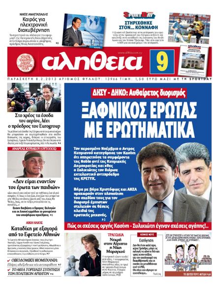 Η «Αλήθεια», υπό τον τίτλο «Ξαφνικός έρωτας με ερωτηματικά», γράφει ότι τον περασμένο Νοέμβριο ο Άντρος Κυπριανού κατηγόρησε τον Κασίνη ότι υπηρετούσε τα συμφέροντα της Noble αντί της Κυπριακής Δημοκρατίας και χθες ο Συλικιώτης τον διόρισε εκτελεστικό αντιπρόεδρο της ΚΡΕΤΥΚ. Γράφει ακόμα ότι η συγγραφέας Νίκη Μαραγκού σκοτώθηκε χθες σε τροχαίο δυστύχημα στην Αίγυπτο, όπου έπαιρνε μέρος σε σεμινάριο. Αλλού αναφέρεται σε δήλωση του επικεφαλής του Γιούρογκρουπ Γερούν Ντάισελμπλουμ ότι τα μελλοντικά έσοδα της Κύπρου από το φυσικό αέριο θα μπορούσαν να συμπεριληφθούν στο σχέδιο διάσωσης της χώρας.