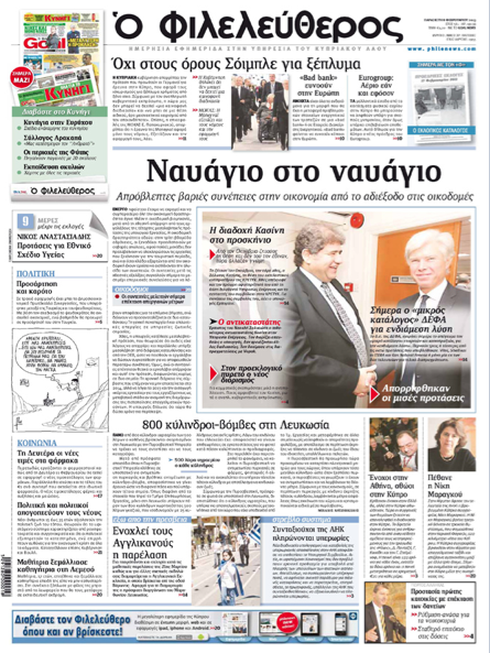 Ο «Φιλελεύθερος», υπό τον τίτλο «Ναυάγιο στο ναυάγιο», γράφει ότι ενεργό ηφαίστειο έτοιμο να εκραγεί και να συμπαρασύρει όλη την οικονομική δραστηριότητα έγινε πλέον η οικοδομική βιομηχανία, μετά από τη χθεσινή απόρριψη από τους εργολάβους της τέταρτης μεσολαβητικής πρότασης της υπουργού Εργασίας. «Από τον Οκτώβριο ζητούσε τη θέση και δεν του την έδιναν, τώρα άλλαξαν γνώμη» αναφέρει ο «Φ» για το διορισμό του Σόλωνα Κασίνη στη θέση του εκτελεστικού αντιπροέδρου της ΚΡΕΤΥΚ. Αλλού γράφει ότι πάνω από 800 κύλινδροι υγραερίου των 500 λίτρων ο καθένας βρίσκονται σκορπισμένοι στη Λευκωσία και η ΠΥ τρέχει να τους εντοπίσει και να τους καταγράψει.