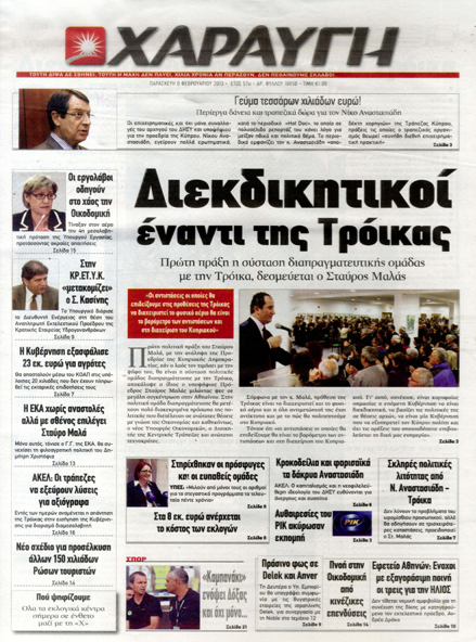 Η «Χαραυγή», υπό τον τίτλο «Διεκδικητικοί έναντι της Τρόικας», γράφει ότι ο Σ. Μαλάς αποκάλυψε ότι η πρώτη πολιτική πράξη του με την ανάληψη της Προεδρίας, εάν ο λαός τον τιμήσει με την ψήφο του, θα είναι η σύσταση πολιτικής ομάδας διαπραγμάτευσης με την Τρόικα. Αλλού γράφει ότι οι επιχειρηματικές και όχι μόνο συναλλαγές του αρχηγού του ΔΗΣΥ και υποψήφιου προέδρου Ν. Αναστασιάδη εγείρουν πολλά ερωτηματικά κατά το περιοδικό «Hot Doc».Αλλού δημοσιεύει χθεσινή δήλωση της Υπουργού Εσωτερικών Ελένης Μαύρου ότι στηρίχθηκαν οι πρόσφυγες και οι ευπαθείς ομάδες.