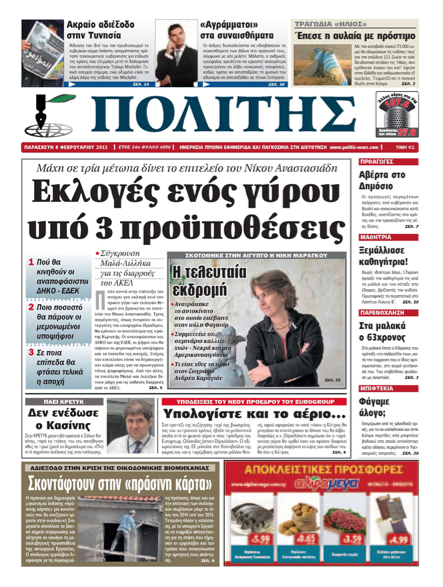 Ο «Πολίτης», υπό τον τίτλο «Εκλογές ενός γύρου υπό τρεις προϋποθέσεις», γράφει ότι το επιτελείο Ν. Αναστασιάδη θεωρεί ότι βρίσκεται πολύ κοντά στην επίτευξη του στόχου για εκλογή από τον πρώτο γύρο εκλογών. Το επιτελείο εκτιμά, γράφει ο «Π», ότι τρεις παράγοντες θα κρίνουν το αποτέλεσμα της πρώτης Κυριακής: οι αναποφάσιστοι του ΔΗΚΟ και της ΕΔΕΚ, οι ψήφοι που θα πάρουν οι μεμονωμένοι υποψήφιοι και τα επίπεδα της αποχής. Αλλού γράφει ότι ο νέος πρόεδρος του Γιούρογκρουπ έβαλε στο τραπέζι της συζήτησης της βιωσιμότητας του κυπριακού χρέους τα μελλοντικά έσοδα από το αέριο. Γράφει ακόμα ότι σκοτώθηκε σε τροχαίο στην Αίγυπτο η Νίκη Μαραγκού, προβάλλοντας φωτογραφία της Μαραγκού.