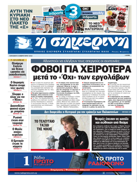 Η εβδομαδιαία «Αντίλογος», υπό τον τίτλο «Στη μάχη της συσπείρωσης», γράφει ότι εννέα μόνο μέρες πριν τις προεδρικές εκλογές της 17ης Φεβρουαρίου 2013 και το πολιτικό θερμόμετρο όχι μόνο βρίσκεται ήδη στα ύψη αλλά παρατηρούνται και ακραία φαινόμενα με βαριές αλληλοκατηγορίες και χαρακτηρισμούς που ξεφεύγουν από κάθε όριο. Ο «Α» φιλοξενεί φωτογραφία από συγκέντρωση διαμαρτυρίας των πολυτέκνων που ζητούν δουλειά. Φιλοξενείται επίσης τρισέλιδο δημοσίευμα για τις συμφωνίες Ζυρίχης-Λονδίνου που υπογράφηκαν στις 11 Φεβρουαρίου 1959.