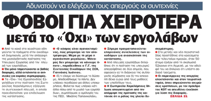 Η «Σημερινή», υπό τον τίτλο «Φόβοι για χειρότερα μετά το ‘Όχι’ των εργολάβων», γράφει πως τα πράγματα στην οικοδομική βιομηχανία οδηγούνται από το κακό στο χειρότερο, μετά την απόρριψη της μεσολαβητικής πρότασης της Υπουργού Εργασίας από την πλευρά των εργολάβων. Η «Σ» φιλοξενεί φωτογραφία της συγγραφέως Νίκης Μαραγκού η οποία έχασε τη ζωή της σε δυστύχημα στην Αίγυπτο. Αλλού γράφει πως ως εκ θαύματος σώθηκαν δυο νεαρές όταν το όχημα στο οποίο επέβαιναν κατέπεσε σε κανάλι.