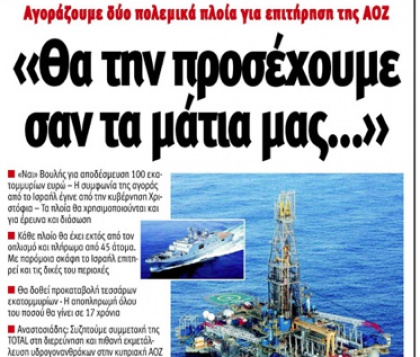 Η «Αλήθεια» προβάλλει το κύριο θέμα της, με τίτλο «Θα την προσέχουμε σαν τα μάτια μας…», και αναφέρει ότι η Βουλή αποδέσμευσε 100 εκ. ευρώ για αγορά δύο πολεμικών πλοίων για επιτήρηση της ΑΟΖ. Θα χρησιμοποιούνται και για έρευνα και διάσωση. Γράφει επίσης ότι η Βουλή θα ζητήσει γνωμάτευση από το Γενικό Εισαγγελέα Πέτρο Κληρίδη κατά πόσον η Συμμαχία των Πολιτών μπορεί να θεωρηθεί κοινοβουλευτικός πολιτικός σχηματισμός. Αναφέρει ακόμα ότι δυσοίωνες είναι οι προβλέψεις για την πορεία της ανεργίας, αφού η Κύπρος κατέχει τα σκήπτρα στην Ευρωζώνη με 70 χιλιάδες ανέργους και τα ταμεία των Κοινωνικών Ασφαλίσεων και του Πλεονάζοντος Προσωπικού να γονατίζουν υπό το βάρος των χιλιάδων ανέργων.