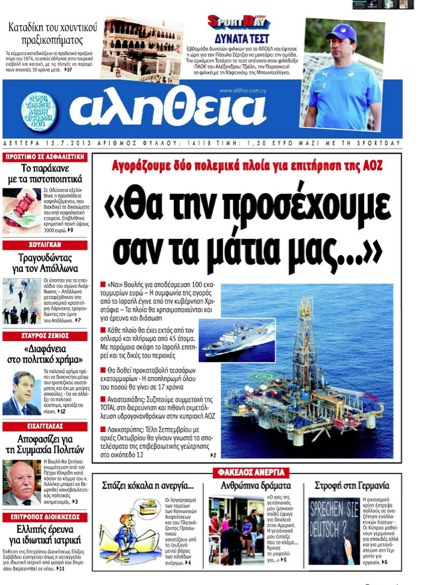 Η «Αλήθεια» προβάλλει το κύριο θέμα της, με τίτλο «Θα την προσέχουμε σαν τα μάτια μας…», και αναφέρει ότι η Βουλή αποδέσμευσε 100 εκ. ευρώ για αγορά δύο πολεμικών πλοίων για επιτήρηση της ΑΟΖ. Θα χρησιμοποιούνται και για έρευνα και διάσωση. Γράφει επίσης ότι η Βουλή θα ζητήσει γνωμάτευση από το Γενικό Εισαγγελέα Πέτρο Κληρίδη κατά πόσον η Συμμαχία των Πολιτών μπορεί να θεωρηθεί κοινοβουλευτικός πολιτικός σχηματισμός. Αναφέρει ακόμα ότι δυσοίωνες είναι οι προβλέψεις για την πορεία της ανεργίας, αφού η Κύπρος κατέχει τα σκήπτρα στην Ευρωζώνη με 70 χιλιάδες ανέργους και τα ταμεία των Κοινωνικών Ασφαλίσεων και του Πλεονάζοντος Προσωπικού να γονατίζουν υπό το βάρος των χιλιάδων ανέργων.