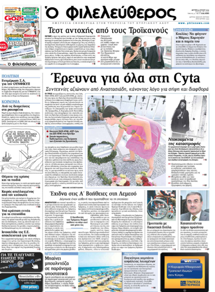 «Ο Φιλελεύθερος», κάτω από τον πρωτοσέλιδο τίτλο «Έρευνα για όλα στη Cyta», γράφει ότι οι τρεις συνεργαζόμενες συντεχνίες της Αρχής Τηλεπικοινωνιών, ΠΑΣΕ-ΑΤΗΚ, ΑΣΕΤ-Cyta και ΣΕΠ-ΑΤΗΚ, με επιστολή τους προς τον Πρόεδρο της Δημοκρατίας καταγγέλλουν ότι η σήψη και η διαφθορά έχουν εισέλθει σε διάφορους τομείς της ΑΤΗΚ. Με ειδικό φωτορεπορτάζ, ο «Φ» αναφέρεται στην επέτειο του πραξικοπήματος και αναφέρει ότι ο Χένρι Κίσιγκερ είχε χειριστεί προσωπικά το θέμα της Κύπρου. Αναφέρει επίσης πρωτοσέλιδα ότι έχιδνα βρέθηκε στην αίθουσα αναμονής του Τμήματος Ατυχημάτων και Επειγόντων Περιστατικών του Γενικού Νοσοκομείου Λεμεσού και δάγκωσε ασθενή, ο οποίος προσπάθησε να τη σταματήσει.