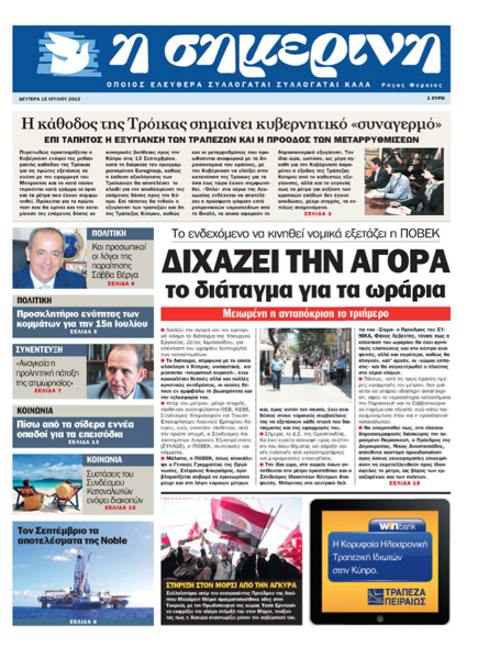 «Η Σημερινή» τιτλοφορεί το κύριο θέμα της «Διχάζει την αγορά το διάταγμα για τα ωράρια» και γράφει ότι κατά τις πρώτες ημέρες εφαρμογής του μέτρου δεν φαίνεται να υπάρχει ιδιαίτερη ανταπόκριση αφού τα περισσότερα καταστήματα την Παρασκευή και το Σαββατοκυρίακο παρέμειναν κλειστά ενώ κάτω από του αναμενόμενου ήταν και η προσέλευση καταναλωτών. Αλλού αναφέρεται στην κάθοδο της Τρόικας που, όπως γράφει, σημαίνει κυβερνητικό «συναγερμό» αφού πρόκειται για το πρώτο τεστ που θα κρίνει την εκταμίευση της επόμενης δόσης. Προσθέτει ότι τέλη Σεπτεμβρίου ή αρχές Οκτωβρίου θα γίνουν γνωστά τα αποτελέσματα της επιβεβαιωτικής γεώτρησης στο οικόπεδο 12.