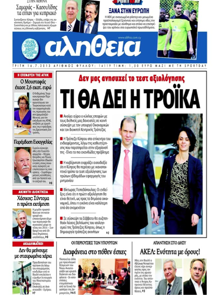 Η «Αλήθεια», υπό τον τίτλο «Τί θα δει η Τρόικα», γράφει ότι ανοίγει αύριο ο κύκλος επαφών με τους διεθνείς δανειστές της Κύπρου σε κοινή σύσκεψη με τον Υπουργό Οικονομικών και τον Διοικητή της Κεντρικής Τράπεζας, και ότι η Τράπεζα Κύπρου βρίσκεται στο επίκεντρο του ενδιαφέροντος, λόγω της καθυστέρησης που παρατηρείται στην εξυγίανσή της. Γράφει, επίσης, ότι η Πρόεδρος της Ερευνητικής Επιτροπής υπέβαλε χθες με ερωτήσεις της ότι ο Κηδεμόνας Τ/κ Περιουσιών δεν προστάτευσε τον Τουρκοκύπριο κατά την αγοραπωλησία της περιουσίας του στην περιοχή Δρομολαξιά-Μενεού για την επένδυση της ΑΤΗΚ. Επίσης, γράφει ότι υλοποιείται άλλη μια προεκλογική δέσμευση του Προέδρου Αναστασιάδη για χρηστή διοίκηση και διαφάνεια, όσον αφορά τις περιουσίες των Υπουργών της Κυβέρνησης.