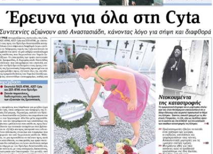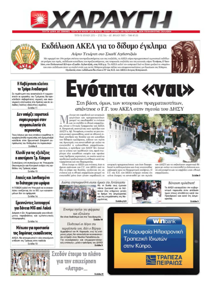 Η «Χαραυγή», υπό τον τίτλο «Ενότητα ‘ναι’ «, γράφει ότι μόνο με την παραδοχή των ιστορικών γεγονότων και πραγματικοτήτων μπορεί να οικοδομηθεί η ενότητα και να επέλθει η εθνική συμφιλίωση, τόνισε ο Γενικός Γραμματέας του ΑΚΕΛ, απαντώντας στον Πρόεδρο του ΔΗΣΥ, ο οποίος, κατά τη χθεσινή ειδική συνεδρία της Βουλής για την καταδίκη του δίδυμου εγκλήματος, κάλεσε τον κ. Κυπριανού να συναντηθούν με στόχο να επιτευχθεί η πολυπόθητη συμφιλίωση. Γράφει, επίσης, ότι τιμήθηκε χθες η μνήμη των νεκρών κατά το πραξικόπημα. Επίσης, γράφει ότι η Κυβέρνηση κλείνει το Τμήμα Αναδασμού και ότι, σε περίπτωση που ανασταλούν ή τερματιστούν οι εργασίες του Τμήματος, θα προκληθούν σοβαρότατες νομικές και οικονομικές επιπτώσεις στο κράτος και σε χιλιάδες πολίτες, ιδιοκτήτες και αγρότες.