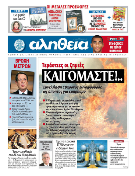 Η αγγλόγλωσση «Cyprus Daily» έχει τίτλο στο κύριό της θέμα «Πλήρως δεσμευμένοι» και αναφέρεται στις δηλώσεις χθες του Κυβερνητικού Εκπροσώπου ότι δεν τίθεται θέμα αλλαγών στο πακέτο διάσωσης της Κύπρου. Φιλοξενώντας φωτογραφία, η εφημερίδα γράφει επίσης στην πρώτη της σελίδα για τις μεγάλες πυρκαγιές χθες στη Λάρνακα και τις υποψίες για εμπρησμό. Αλλού φιλοξενεί δηλώσεις του Βρετανού Ύπατου Αρμοστή ότι η χώρα του εκφράζει ετοιμότητα να παράσχει βοήθεια στην αναδιαμόρφωση της δημόσιας υπηρεσίας.
