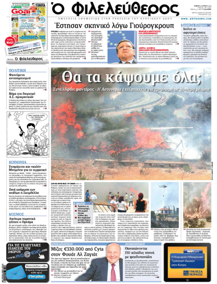 Ο «Φιλελεύθερος» στεγάζει το κύριό του θέμα υπό τον τίτλο «Θα τα κάψουμε όλα;» και αναφέρεται στη φωτιά στη Χοιροκοιτία, με μεγάλη φωτογραφία. Γράφει ότι συνελήφθη φαντάρος και ότι η Αστυνομία έχει στοιχεία για εμπρησμό σε τέσσερα μέτωπα. Αλλού η εφημερίδα αναφέρει ότι διέρρευσε και παρερμηνεύτηκε η επιστολή του Προέδρου της Δημοκρατίας προς τους εταίρους της Κύπρου για το μνημόνιο και προκλήθηκε θύελλα αντιδράσεων. Σε άλλο πρωτοσέλιδο ρεπορτάζ ο «Φ» αναφέρει ότι την άλλη εβδομάδα θα ολοκληρωθεί το σχέδιο εθελούσιας εξόδου από την Τράπεζα Κύπρου και θα εφαρμοστεί από τον Ιούλιο.