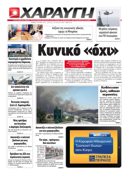 Με τίτλο «Κυνικό ‘όχι’», η «Χαραυγή» στο κύριό της θέμα γράφει ότι ο Πρόεδρος Αναστασιάδης εισέπραξε ένα σκληρό όχι από Βρυξέλλες και Βερολίνο στην επιστολή του για αλλαγές στο κυπριακό πρόγραμμα διάσωσης και φιλοξενεί και τις δηλώσεις της Κυβέρνησης. Σε άλλο θέμα, με φωτογραφία, αναφέρει ότι κινδύνευσαν ζωές και χάθηκαν περιουσίες στη μεγάλη φωτιά της Χοιροκοιτίας. Αλλού η «Χ» γράφει ότι διεξάγεται μεγάλης κλίμακας ισραηλινή άσκηση στο FIR Λευκωσίας, η οποία, όπως δήλωσε ο Υπουργός Εξωτερικών, δεν έχει καμία σχέση με την κυπριακή ΑΟΖ.