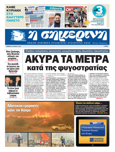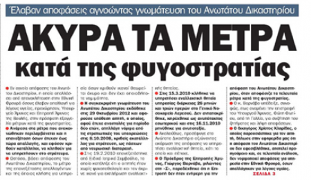 «Άκυρα τα μέτρα κατά της φυγοστρατίας» είναι ο τίτλος του κυρίου θέματος της «Σημερινής», που γράφει ότι το Υπουργείο Άμυνας και η Επιτροπή Άμυνας της Βουλής προχώρησαν στην εξαγγελία μέτρων κατά της φυγοστρατίας, αγνοώντας απόφαση του Ανωτάτου Δικαστηρίου, η οποία απαλλάσσει από επανακλήτευση όσους έλαβαν απαλλαγή για λόγους υγείας. Αλλού αναφέρεται στις τοποθετήσεις χθες της Κυβέρνησης για το κυπριακό μνημόνιο με αφορμή πληροφορίες στους Financial Times για τις αντιδράσεις των εταίρων της Κύπρου. Επίσης η «Σ» στο πρωτοσέλιδό της αναφέρεται στη μεγάλη φωτιά χθες στη Χοιροκοιτία και φιλοξενεί και φωτογραφικό υλικό.