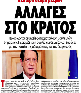 Ο «Πολίτης», υπό τον τίτλο «Πρώτες αποφάσεις για επανασχεδιασμό», γράφει ότι εν αναμονή του νέου οδικού χάρτη, που σύμφωνα με τις πρόσφατες εξαγγελίες πρέπει να είναι έτοιμος τέλος της εβδομάδας, ο Πρόεδρος Αναστασιάδης θα έχει σήμερα συνάντηση με τον Υπουργό Ενέργειας, Εμπορίου, Βιομηχανίας και Τουρισμού Γιώργο Λακκοτρύπη, προκειμένου να συζητηθεί το χρονικό πλαίσιο συγχώνευσης της ΔΕΦΑ και της ΚΡΕΤΥΚ. Γράφει, επίσης, ότι από σήμερα οι καταθέτες της Τράπεζας Κύπρου με καταθέσεις άνω των 100.000 θα δουν την πρώτη αφαίρεση που αφορά την έκδοση μετοχών. Επίσης, κάτω από φωτογραφία, γράφει ότι η Ιταλία βγήκε από το πολιτικό αδιέξοδο, όμως η ορκωμοσία της κυβέρνησης Λέτα σημαδεύτηκε από επίθεση οπλοφόρου έξω από το πρωθυπουργικό γραφείο.