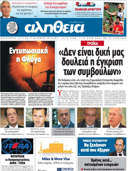 Η «Αλήθεια» στο κύριο της θέμα με τίτλο «Δεν είναι δική μας δουλειά η έγκριση των συμβούλων», γράφει ότι πηγή της εφημερίδας στην Ευρωπαϊκή Επιτροπή διαψεύδει ότι η Τρόικα έχει ή θα έχει οποιαδήποτε ανάμειξη στην έγκριση των μελών του νέου ΔΣ της Τράπεζα Κύπρου. Αλλού, κάτω από σχετική φωτογραφία από τη φλόγα στο τεμάχιο 12 της κυπριακής ΑΟΖ, γράφει ότι η φλόγα ανάβει για να καίει το φυσικό αέριο που βγαίνει στην επιφάνεια, ώστε αυτό να διαχέεται στην ατμόσφαιρα. Σε άλλο της θέμα, η εφημερίδα γράφει για τη συνέντευξη του Προέδρου Αναστασιάδη στο ρωσικό πρακτορείο ειδήσεων Itar-Tass, με την οποία διαβεβαίωσε για την ετοιμότητα να αποζημιωθεί μέρος των καταθέσεων που έχουν χάσει Ρώσοι μετά το κούρεμα που αποφάσισε το Eurogroup για την Τράπεζα Κύπρου και την Λαϊκή.