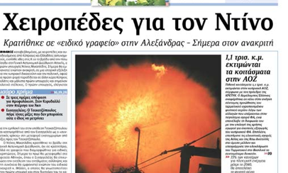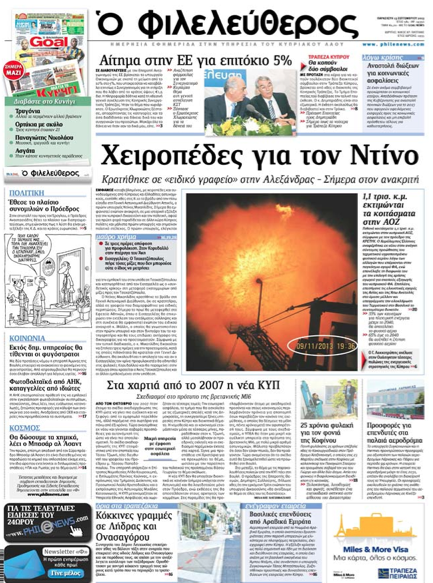 «Ο Φιλελεύθερος» υπό τον τίτλο «Χειροπέδες για τον Ντίνο» γράφει στο κύριο του θέμα ότι εμφανώς καταβεβλημένος, με χειροπέδες και συνοδευόμενος από Κύπριους και Ελλαδίτες αστυνομικούς εισήλθε χθες στις 8:10 το βράδυ από την πίσω είσοδο στη Γενική Αστυνομική Διεύθυνση Αττικής, ο πρώην Υπουργός Ντίνος Μιχαηλίδης, ενώ σήμερα θα εμφανιστεί ενώπιον ανακριτή. Αλλού, γράφει ότι σε διαβουλεύσεις με την Επιτροπή Ανταγωνισμού της ΕΕ βρίσκεται το Υπουργείο Οικονομικών με σκοπό τη μείωση από 10% σε 5% που υποχρεούται να καταβάλει ετησίως ο Συνεργατισμός για τη στήριξη που θα λάβει από το κράτος. Σε άλλο του θέμα γράφει ότι παραμένει στα συρτάρια για πάνω από έξι χρόνια το σχέδιο αναδιοργάνωσης της ΚΥΠ, ώστε να γίνει πιο ευέλικτη και να ξεφύγει από το αμαρτωλό παρελθόν της.